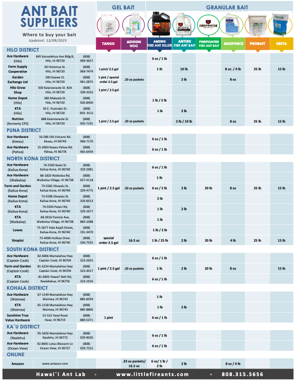 To effectively reduce the number of Little Fire Ants (LFA) around your home, you need to apply bait where LFA like to nest – on the ground and in trees. One problem facing the homeowner is that virtually all commercial baits consist of small granules. These are easy to spread on the ground, but can not be applied to vegetation. Ants in the trees will not necessarily come to the ground to forage on the granules. If only the colonies on the ground are treated, neighboring ants living in trees will quickly spread back to the ground. If you have trees over 6 ft. tall, you need to apply Hawaiʻi Ant Lab’s gel bait with Tango™ or Advion® WDG that will stick to the trunk and main branches. Learn more about gel baits in our guide to Mixing HAL Gel Bait for Control of Little Fire Ants.