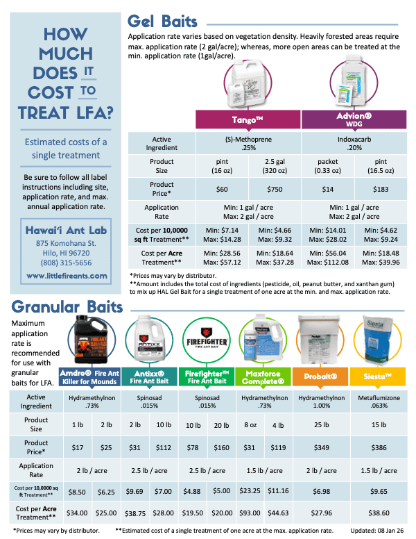 If you have fruit trees or vegetable plants on your property, you are limited by which bait products you can use. Many pesticides are not registered for use on food plants. Be sure to read a product’s label carefully to make sure whether it can be applied on edible plants and if your crop or fruit is listed. You can download product labels by going to the Hawaii Pesticide Information Retrieval System. Baits available in Hawaiʻi for the control of LFA that may be used on or near food plants include the following: